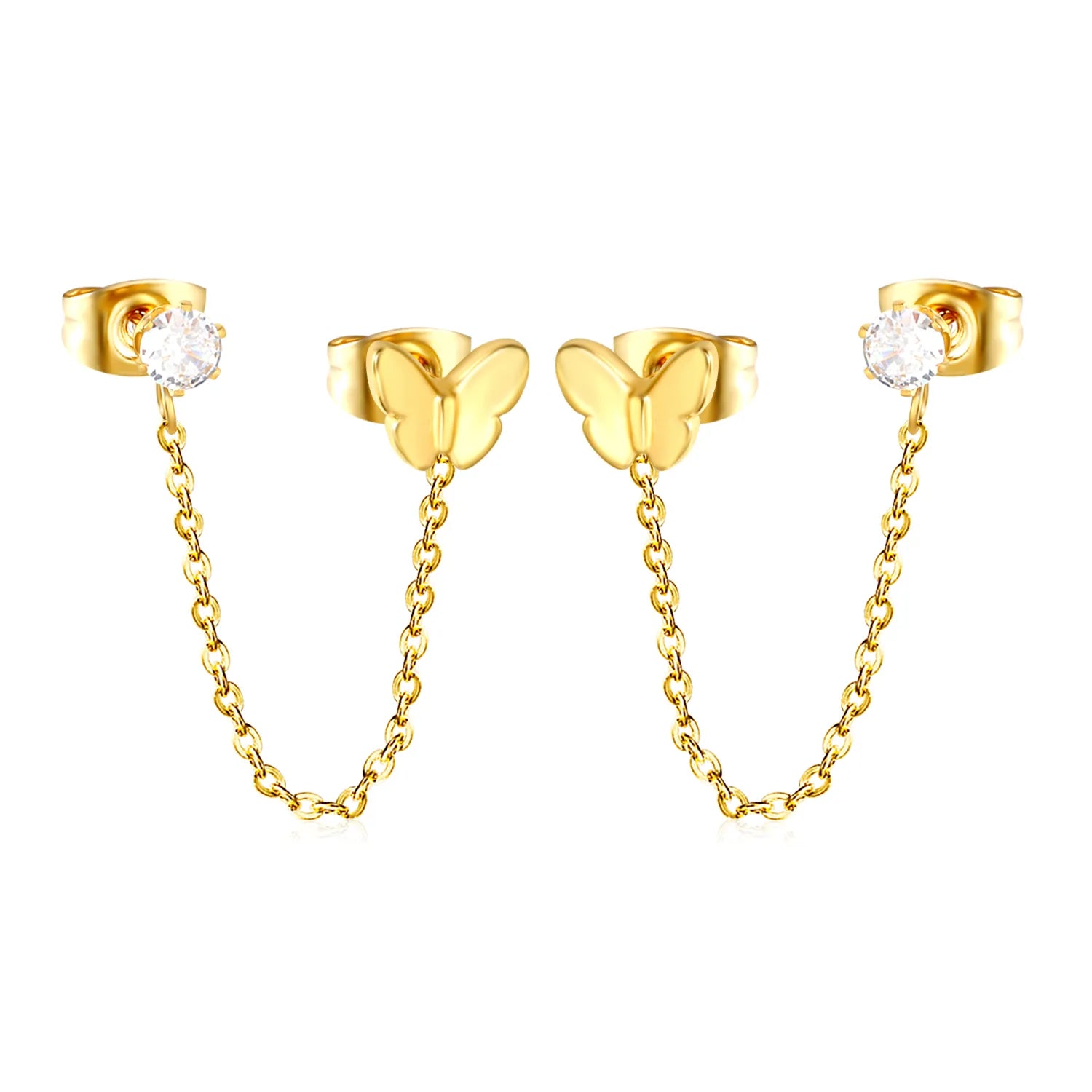 Earrings 6*7mm butterfly + 0.4mm cross chain 4cm + 4mm prong white zircon (double earrings) gold