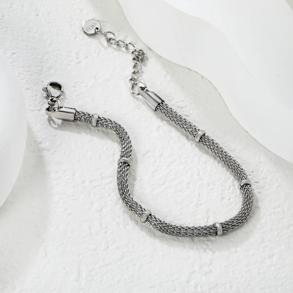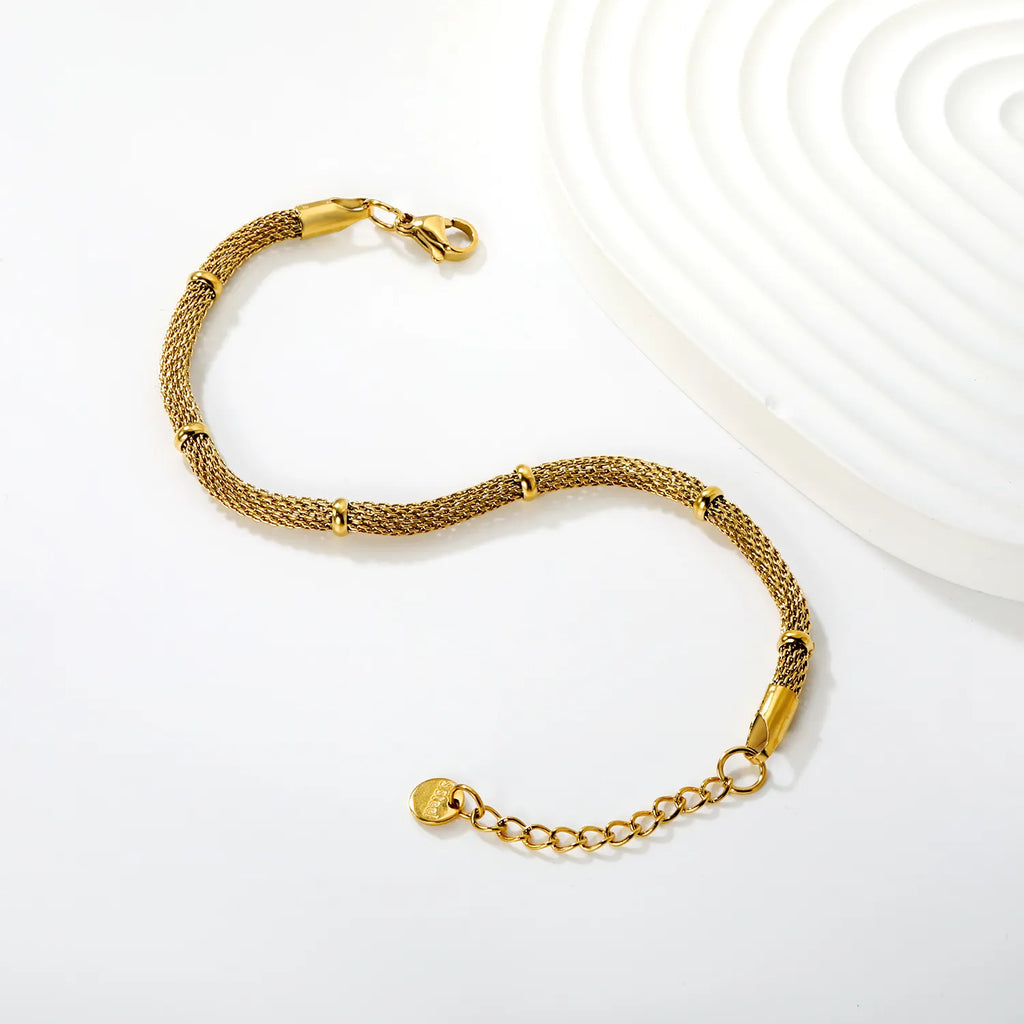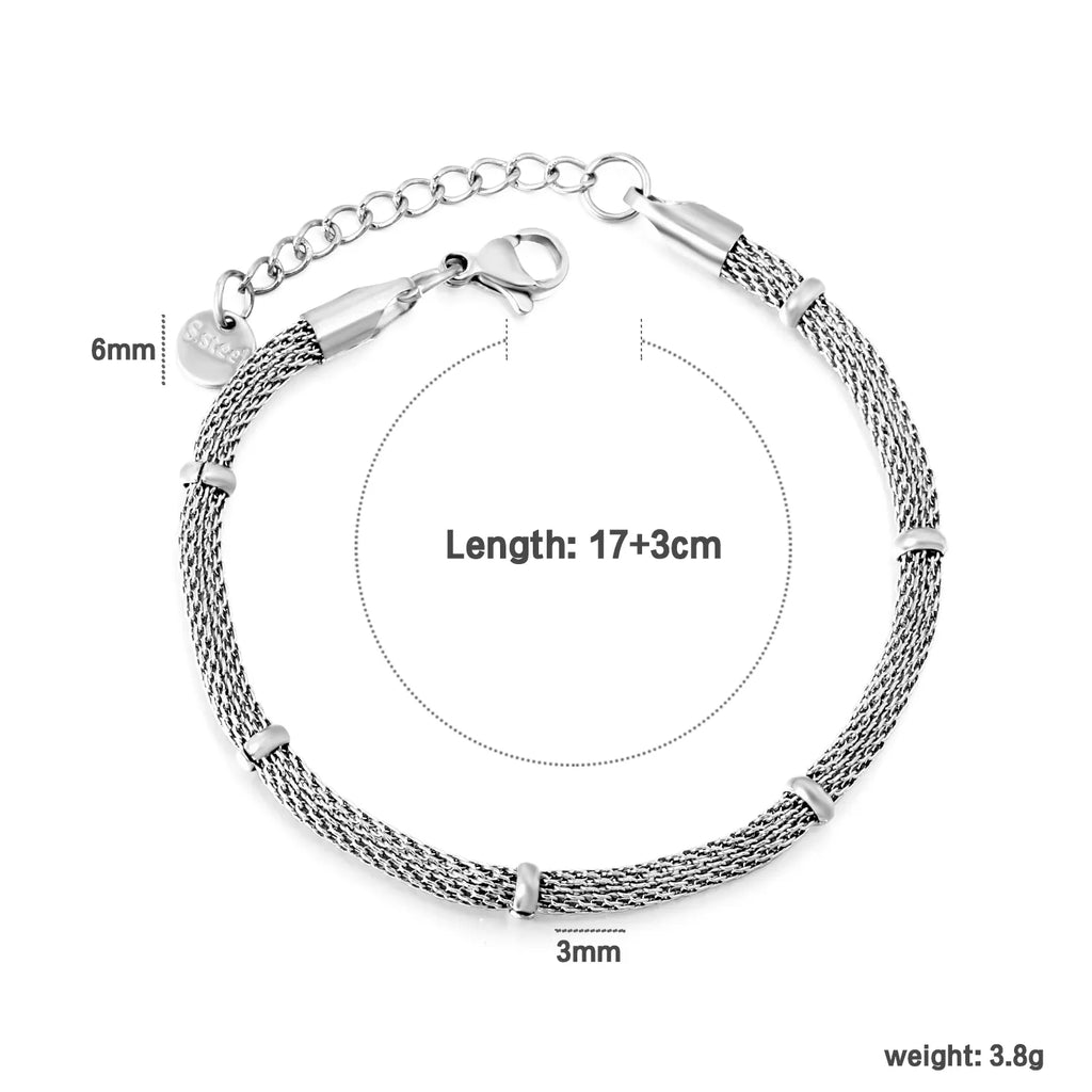 Bracelet Width: 3.3mm Length: 17cm + 3cm + 6mm round pendant Steel-tone gold This sophisticated bracelet combines understated elegance with practical design. The slender 3.3mm band extends to 17cm with an adjustable 3cm extension, accommodating various wrist sizes. A delicate 6mm round pendant in steel-tone gold adds a subtle focal point without compromising the minimalist aesthetic. Constructed from durable stainless steel with a warm gold finish, this piece transitions seamlessly from everyday wear to special occasions, offering both versatility and refined style.