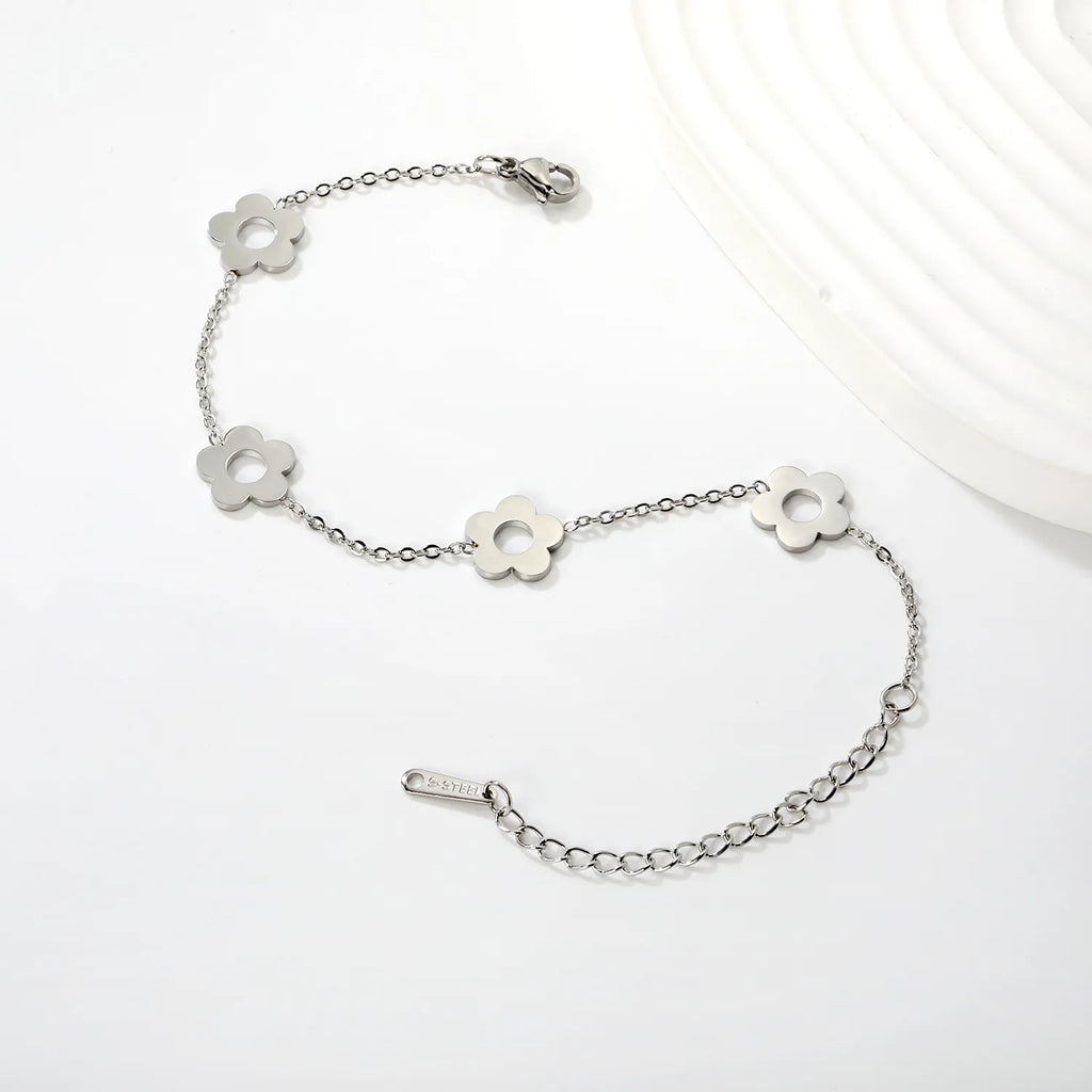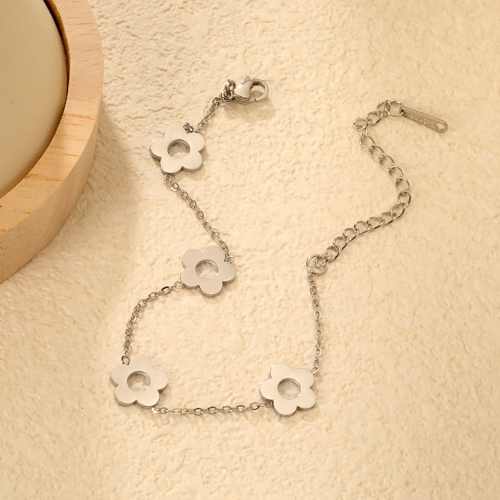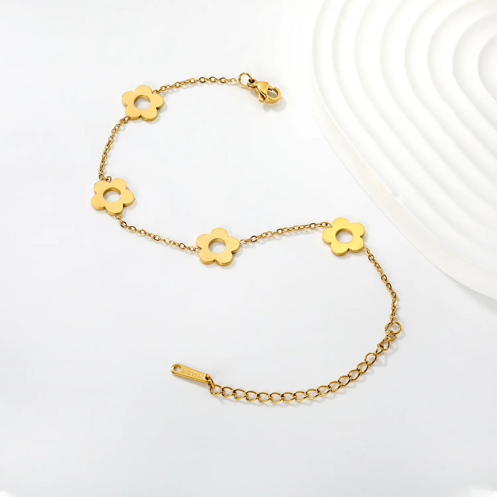 This striking bracelet features four intricately openwork five-petaled flowers rendered in polished stainless steel, blending cool steel gray with warm gold accents for sophisticated contrast. Each flower showcases meticulous detailing that catches light beautifully, creating dimension and visual interest. The combination of matte and polished finishes elevates the design while maintaining a refined, contemporary aesthetic. Versatile enough to complement both minimalist and statement-focused styling, this piece delivers understated luxury with architectural precision.