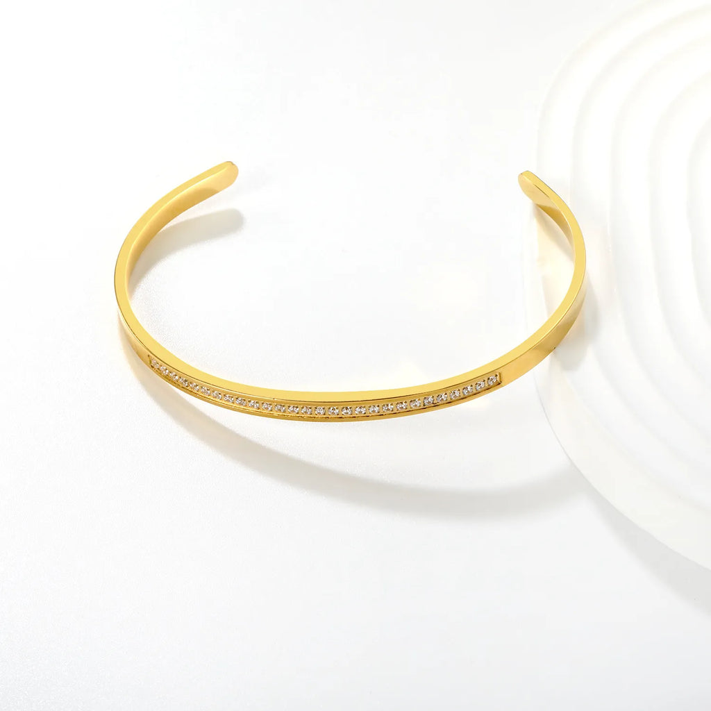 Open Bangle Gold Width 3mm Inner Diameter 58mm Technique: Cut + Full Polish + CNC Stone Setting Crafted with precision engineering, this open bangle features a refined 3mm width and 58mm inner diameter, designed for a comfortable, versatile fit. The multi-step finishing process—including precision cutting, full polish, and CNC stone setting—delivers a flawless surface with expertly secured gemstone accents. Constructed from quality gold, this piece combines contemporary minimalism with meticulous craftsmanship, making it an elegant addition to any jewelry collection or a thoughtful luxury gift.