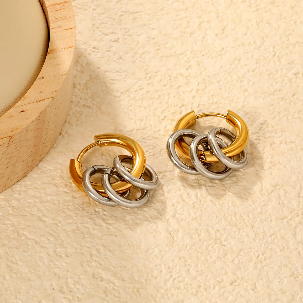 Product Description Discover modern versatility with this two-piece earring ensemble. The round ear hook delivers a sleek, contemporary silhouette with comfortable wearability, while the triple ring design stacks visual interest through layered geometry. Both pieces are constructed from durable stainless steel, engineered for daily wear without compromise. Whether worn individually for minimalist appeal or paired for a bolder statement, this set accommodates diverse styling preferences. The refined proportions and quality craftsmanship make these earrings an essential addition to a curated jewelry wardrobe.