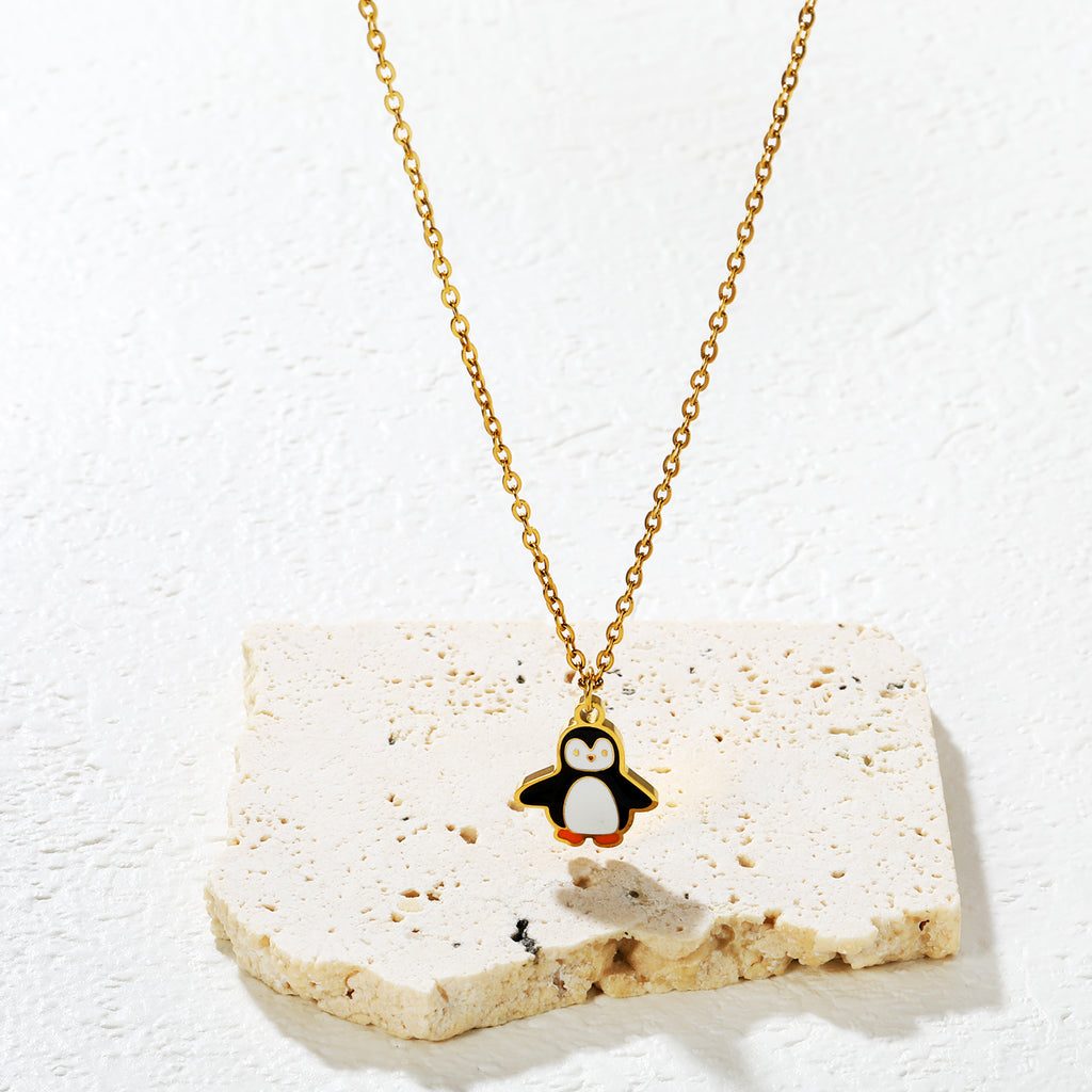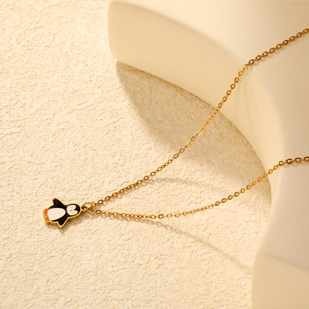 This gold necklace features a finely crafted 12.6*13.3mm penguin pendant suspended from a delicate 0.4mm cross chain with a round tag accent. The design highlights expert craftsmanship, combining playful charm with elegant simplicity. Lightweight and versatile, it’s an ideal accessory for those seeking a distinctive yet refined statement piece.