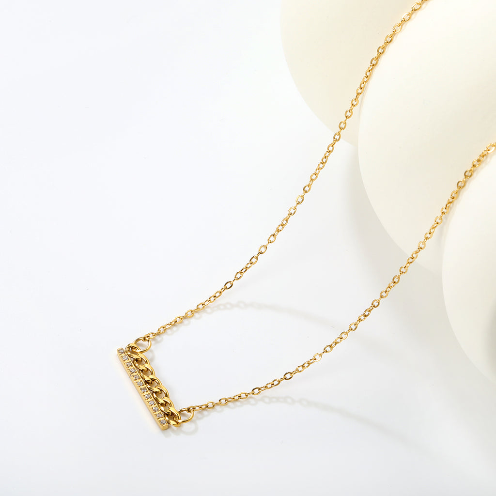 20*2mm single-cut CNC white diamond pendant with 3mm NK chain in 14K gold plating. Features a precision-cut white diamond accent stone, adjustable 42cm + 5cm extension chain, and 6mm round tail label for authenticity. Cross chain design adds contemporary elegance. Ideal for layering or standalone wear. Hypoallergenic stainless steel construction ensures durability and comfort for daily styling.