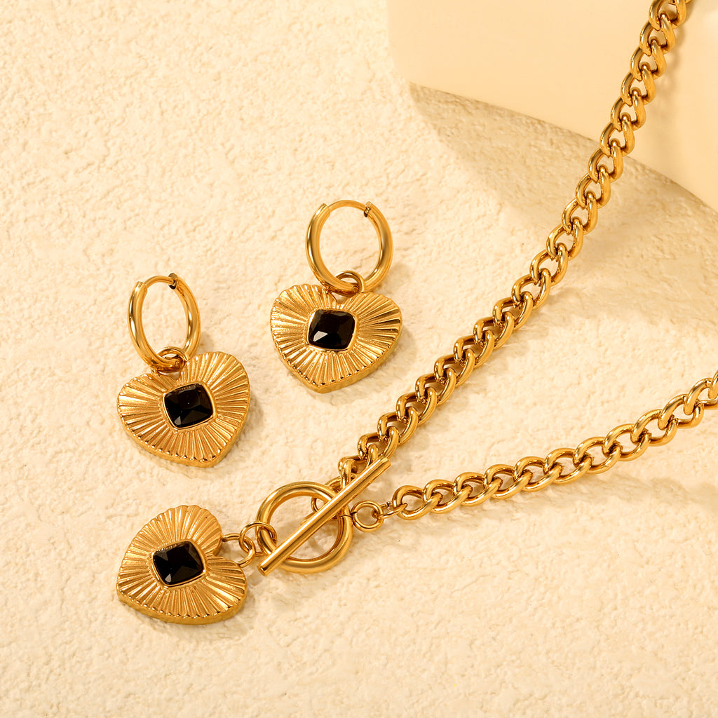 Elevate your jewelry collection with this refined White Diamond Heart Set in gold. This three-piece ensemble features matching heart-shaped earrings (18×16mm) and a coordinating pendant, each showcasing brilliant white diamond accents. The 43cm side chain with secure OT clasp ensures versatile styling for layering or standalone wear. Crafted from premium stainless steel with gold plating, this set delivers luxury aesthetics with everyday durability. Perfect for gifting or personal indulgence, it transitions seamlessly from casual to formal occasions.