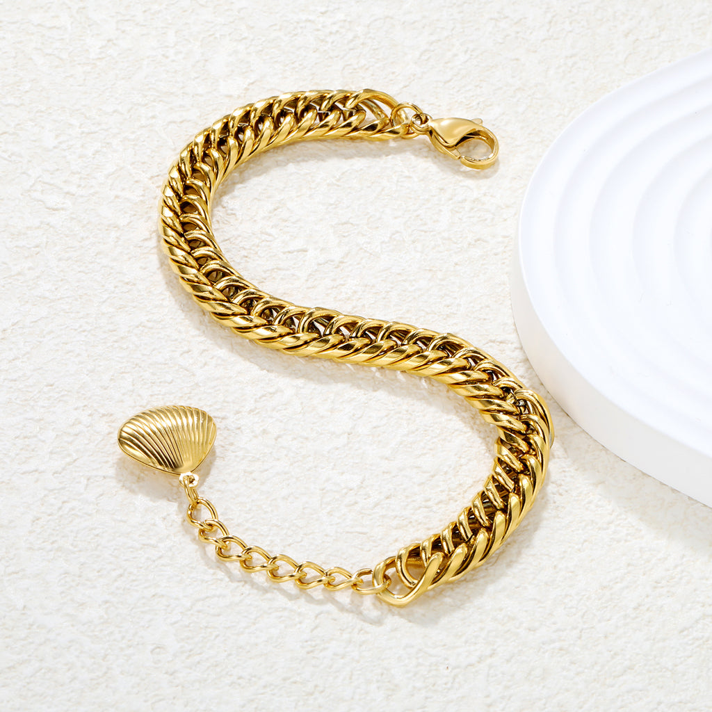 This gold bracelet features two 8mm double-sided rounded chains, creating a balanced and textured look. Measuring 18+3cm, it offers adjustable length for a comfortable fit. The design is accented with a 15 x 13mm shell tail tag, adding a subtle yet distinctive detail. Crafted for durability and style, this piece is a refined addition to any jewelry collection.