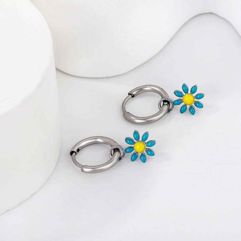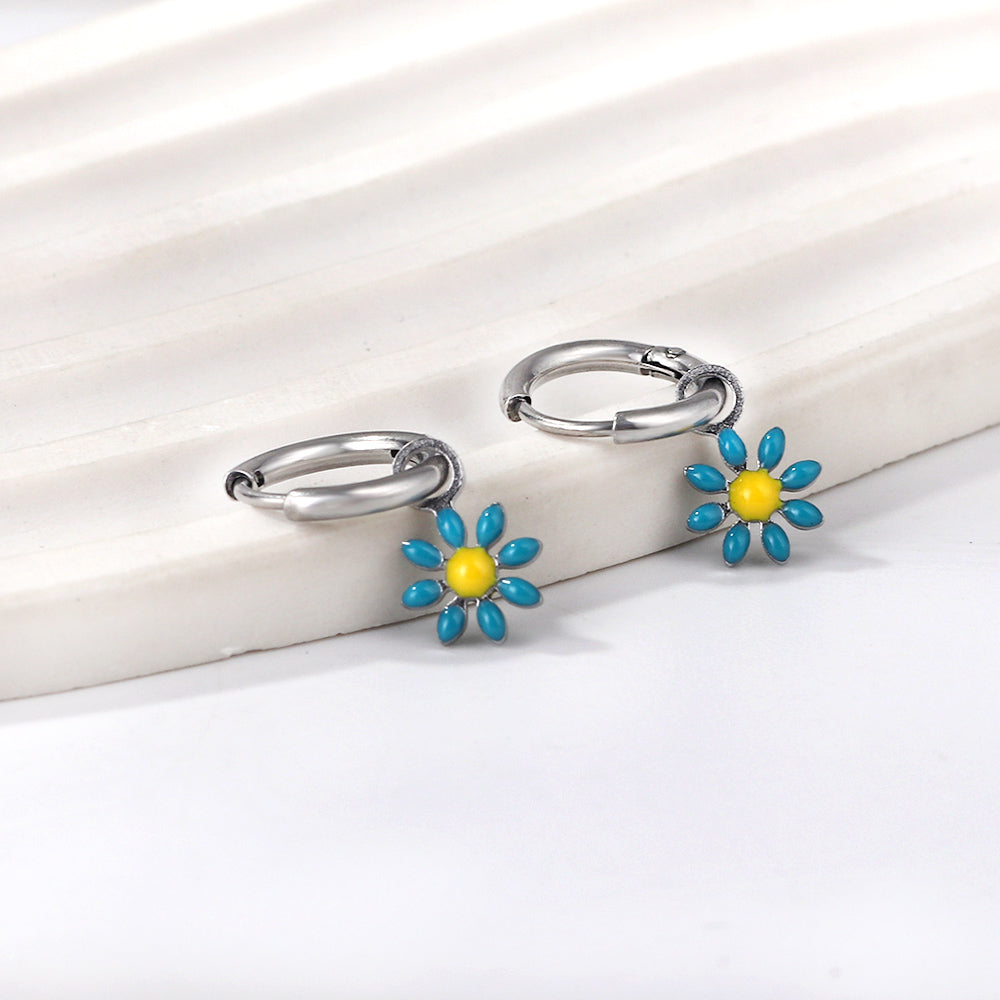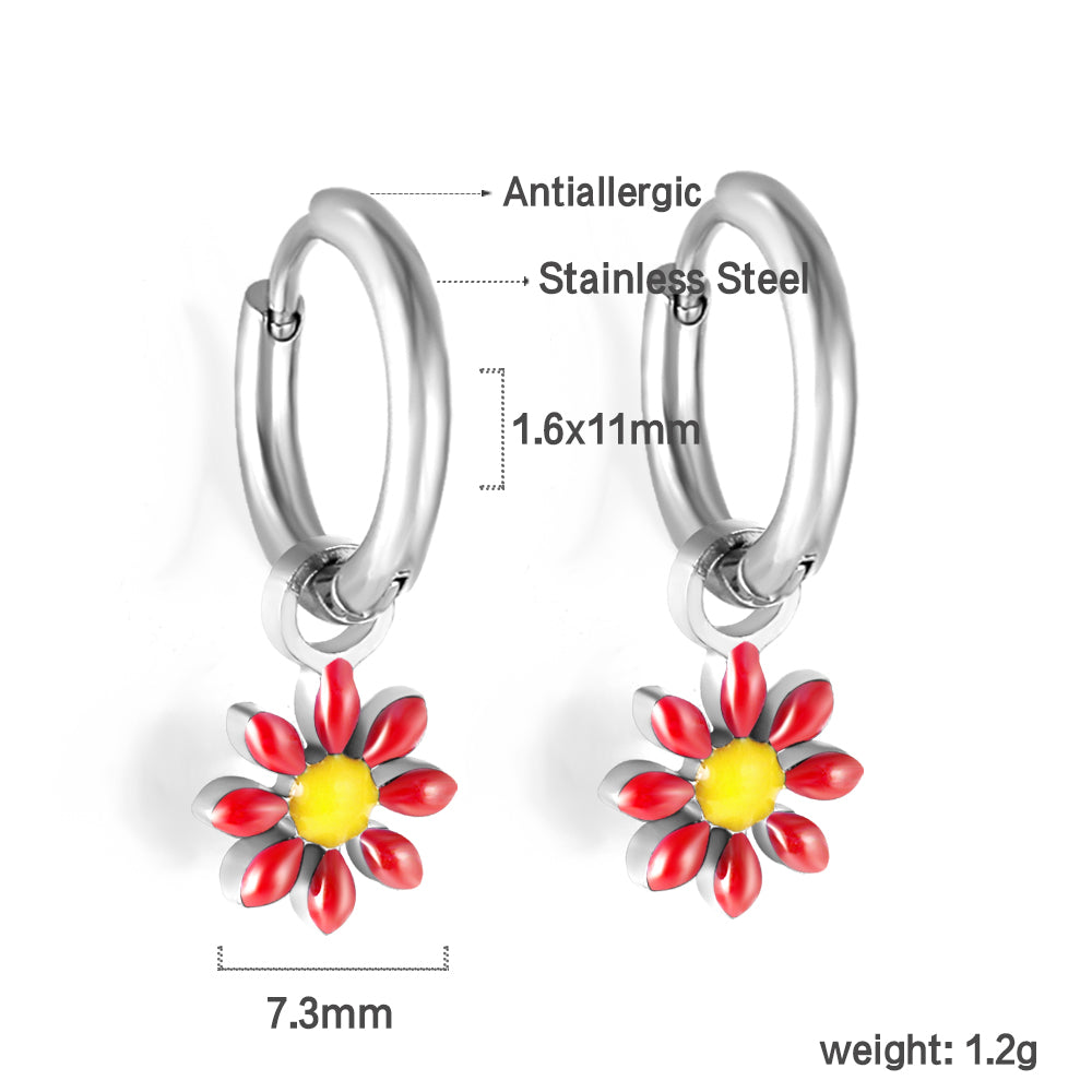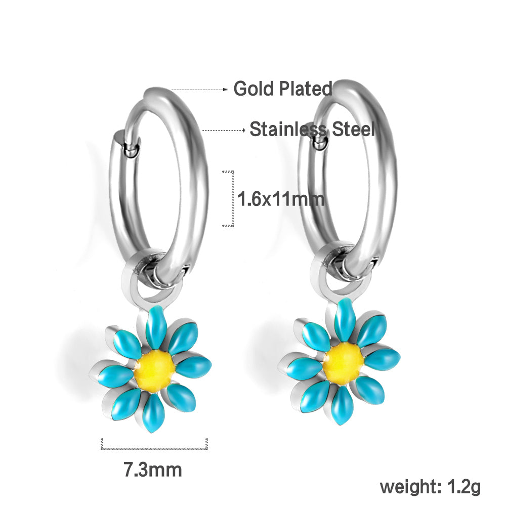 These stunning earrings feature a 1.6x inside diameter 8mm circle, adorned with vibrant black, green, yellow, red, and blue daisies measuring 7.2mm. Elevate your style with the perfect combination of elegance and color.