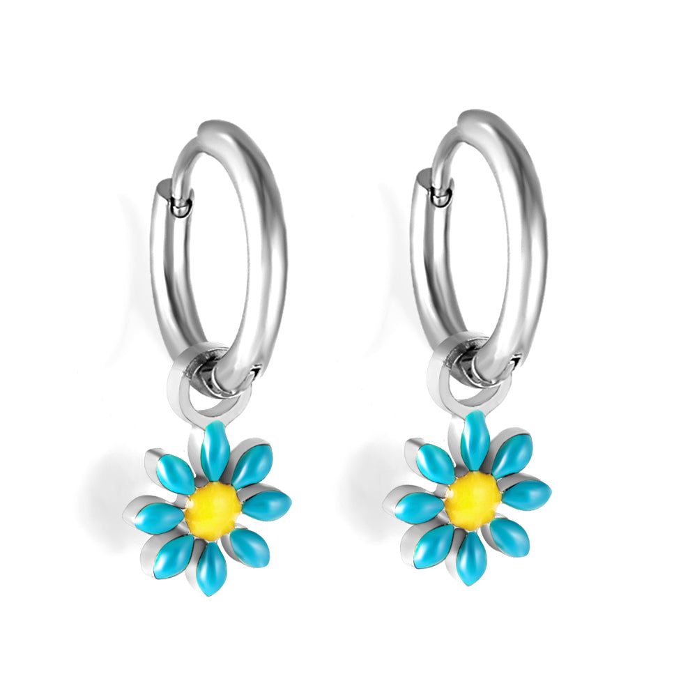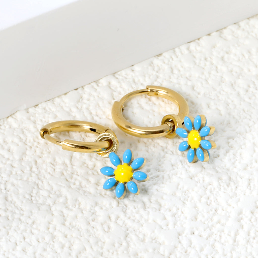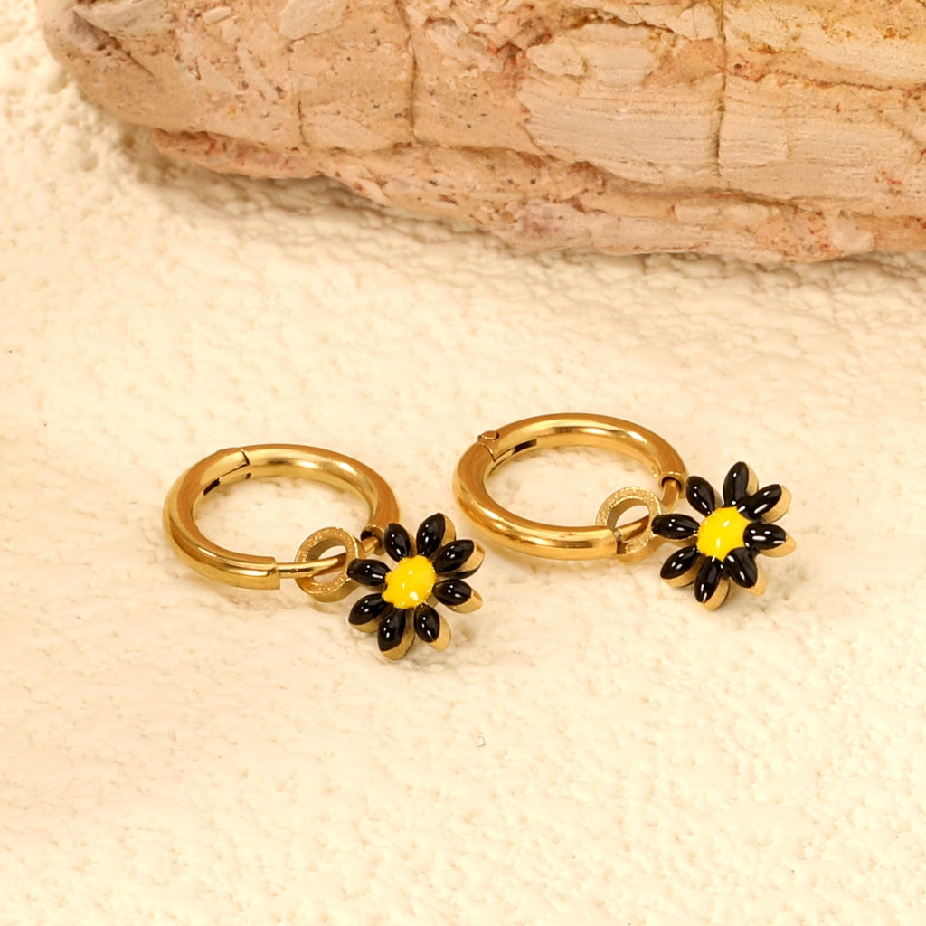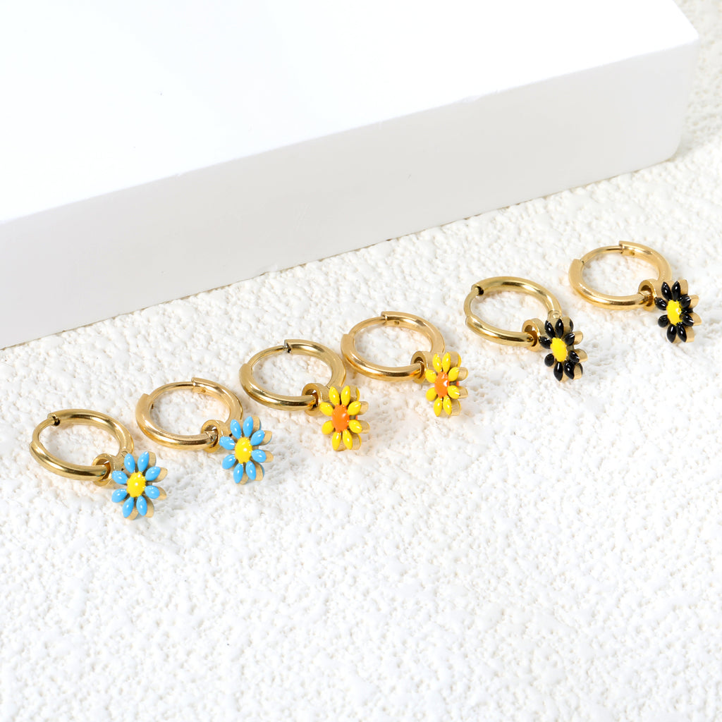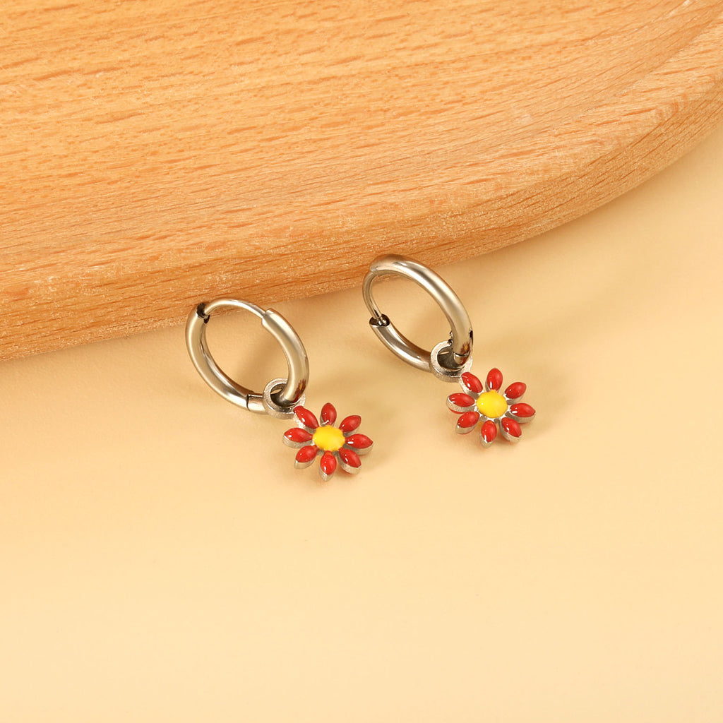 These stunning earrings feature a 1.6x inside diameter 8mm circle, adorned with vibrant black, green, yellow, red, and blue daisies measuring 7.2mm. Elevate your style with the perfect combination of elegance and color.