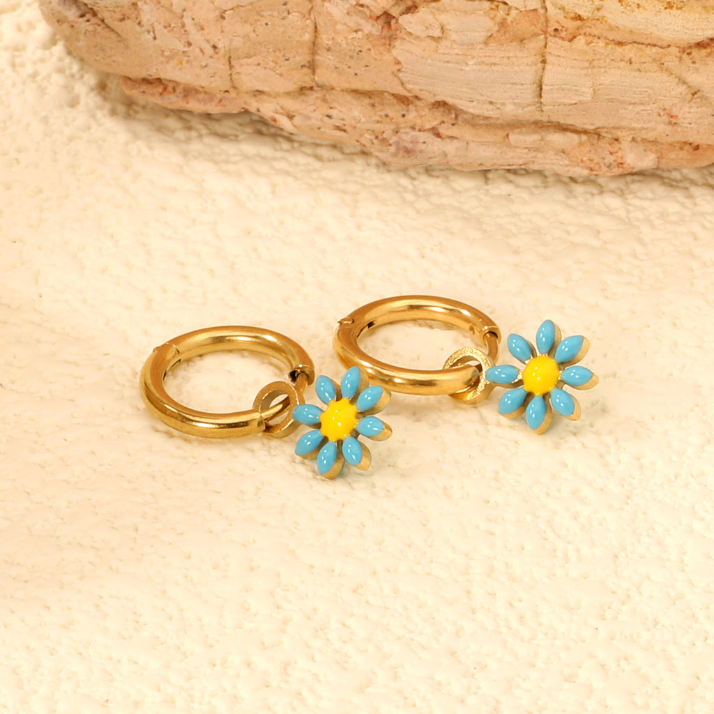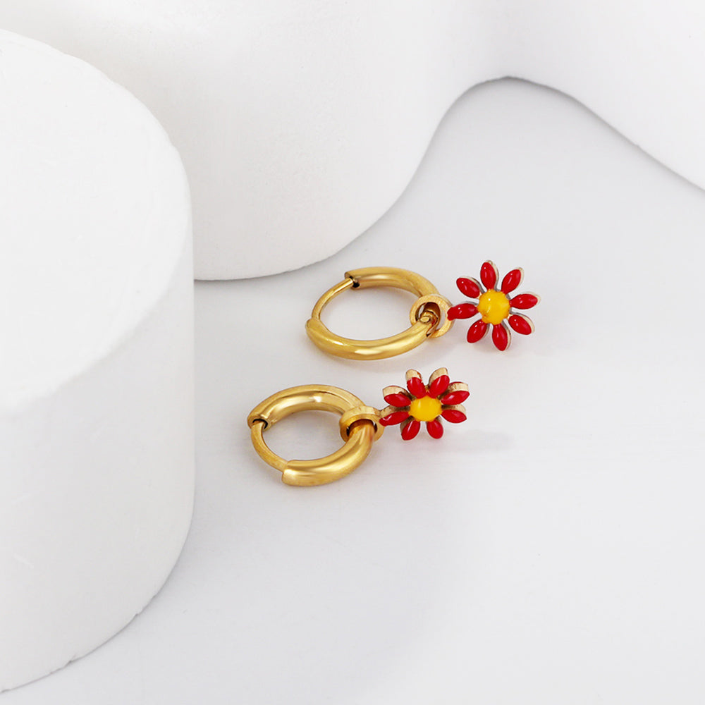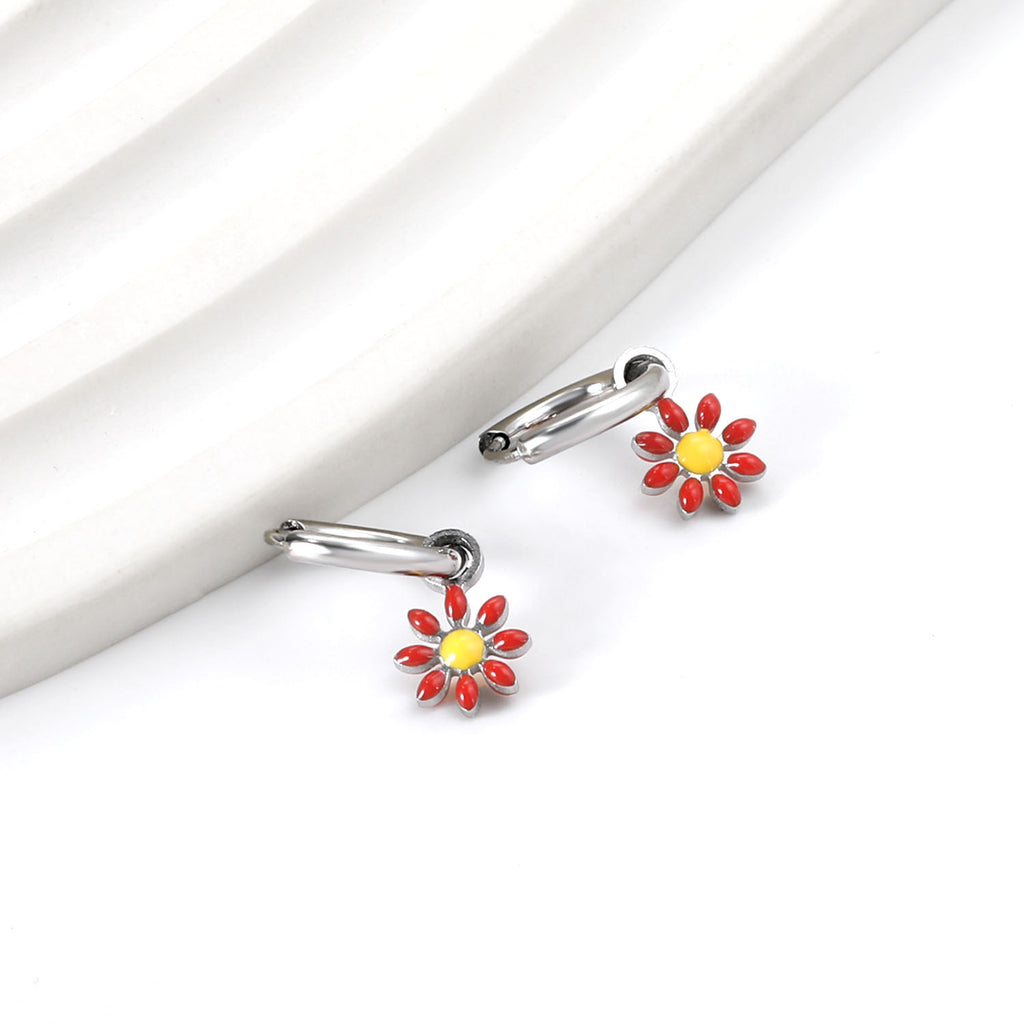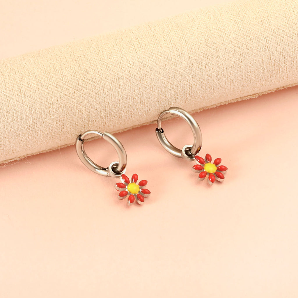 These stunning earrings feature a 1.6x inside diameter 8mm circle, adorned with vibrant black, green, yellow, red, and blue daisies measuring 7.2mm. Elevate your style with the perfect combination of elegance and color.