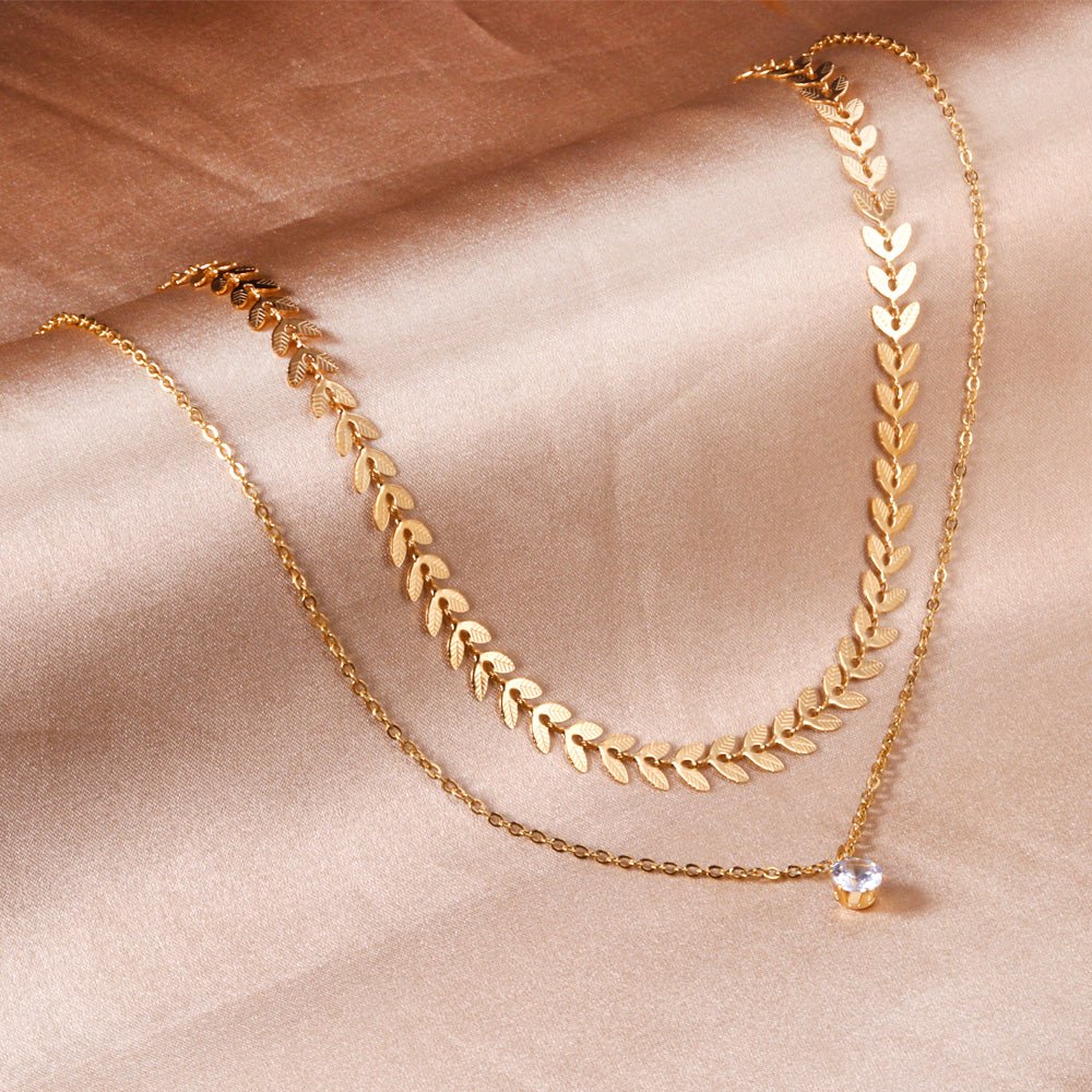 Leaf Accessory + Round Diamond Pendant Double Necklace 42+37+5cm Gold color