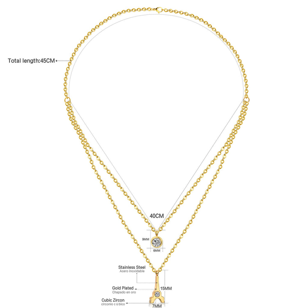 ASON Classic Jewelry Stainless Steel Eiffel Town Pendant Necklace with Round Cubic Zirconia for Women Double Link Chain