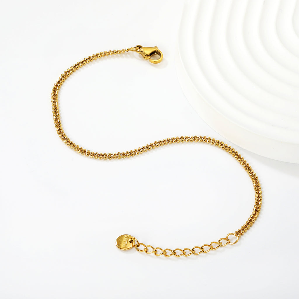 Width: 2.3mm, Thickness: 1.2mm. Double-bead chain, 17+3cm+6mm in length. Round tail style bracelet. Steel color/Gold.