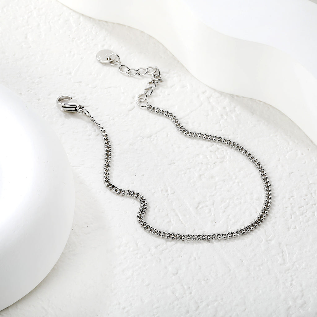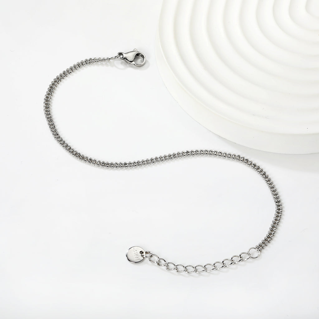 This steel color and gold round tail bracelet is a stylish addition to any outfit. With a width of 2.3mm and thickness of 1.2mm, it is both delicate and durable. The double-bead chain adds a unique touch and the 17+3cm+6mm length provides a comfortable fit. Elevate your look with this versatile piece.