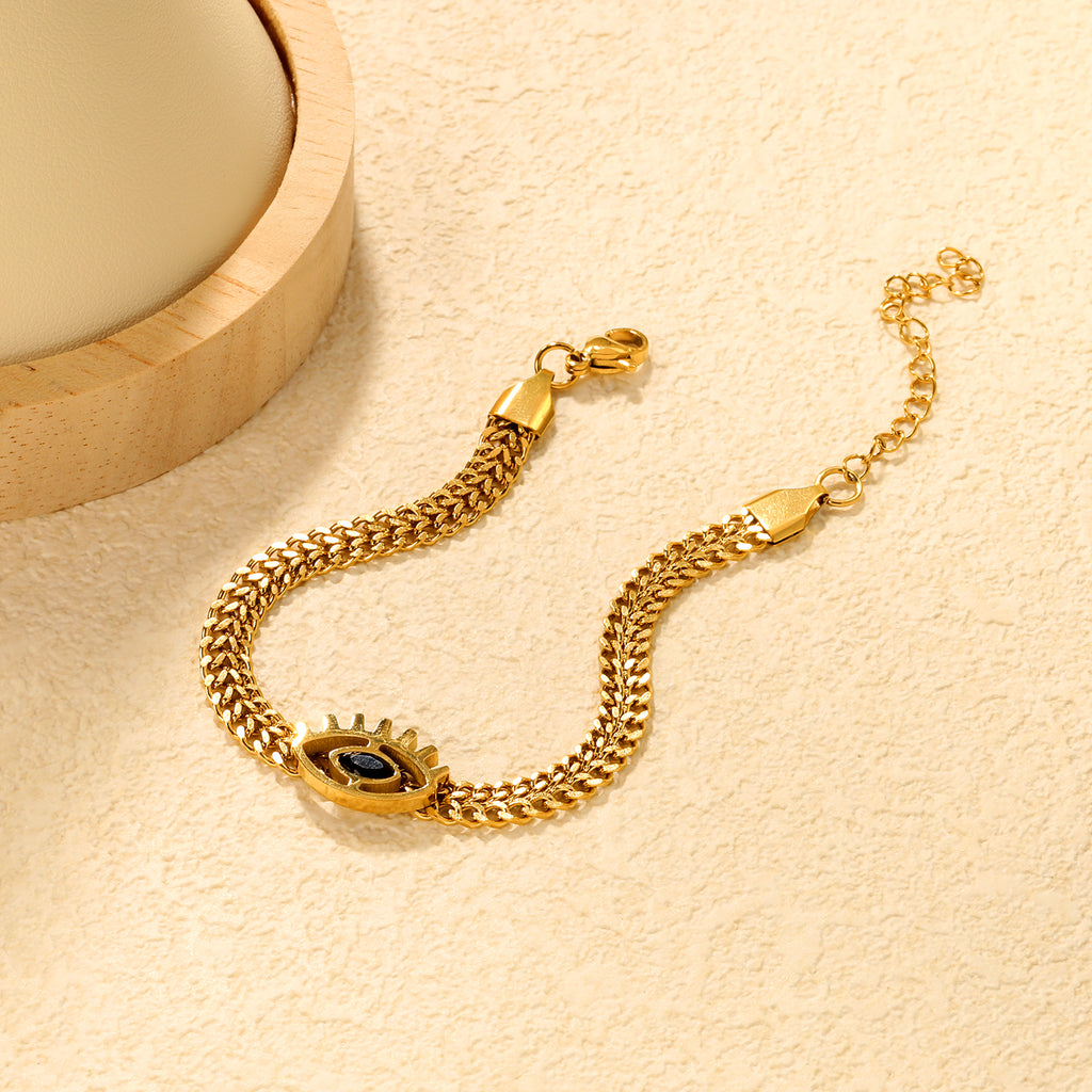 This gold bracelet features a striking 16.5 x 10.7mm eye-shaped pendant, complemented by a 5.4mm wide chain measuring 17+5cm for adjustable comfort. Its refined design combines symbolism with elegance, making it a versatile accessory suitable for both everyday wear and special occasions. Crafted with precision, it ensures lasting quality and a polished finish.