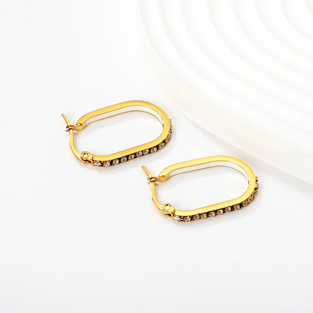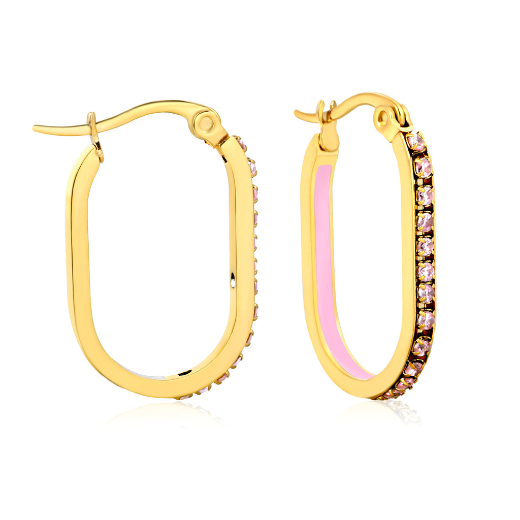 Elevate your jewelry collection with this striking oval-shaped geometric band earring. Measuring 2.26 x 22mm, the design features a sophisticated interplay of white, purple, blue, pink, and orange diamonds arranged in a modern geometric pattern. Crafted in lustrous golden-tone metal with secure ear hooks, these pieces deliver both visual impact and reliable wearability. Perfect for those who appreciate bold, contemporary design with refined craftsmanship.