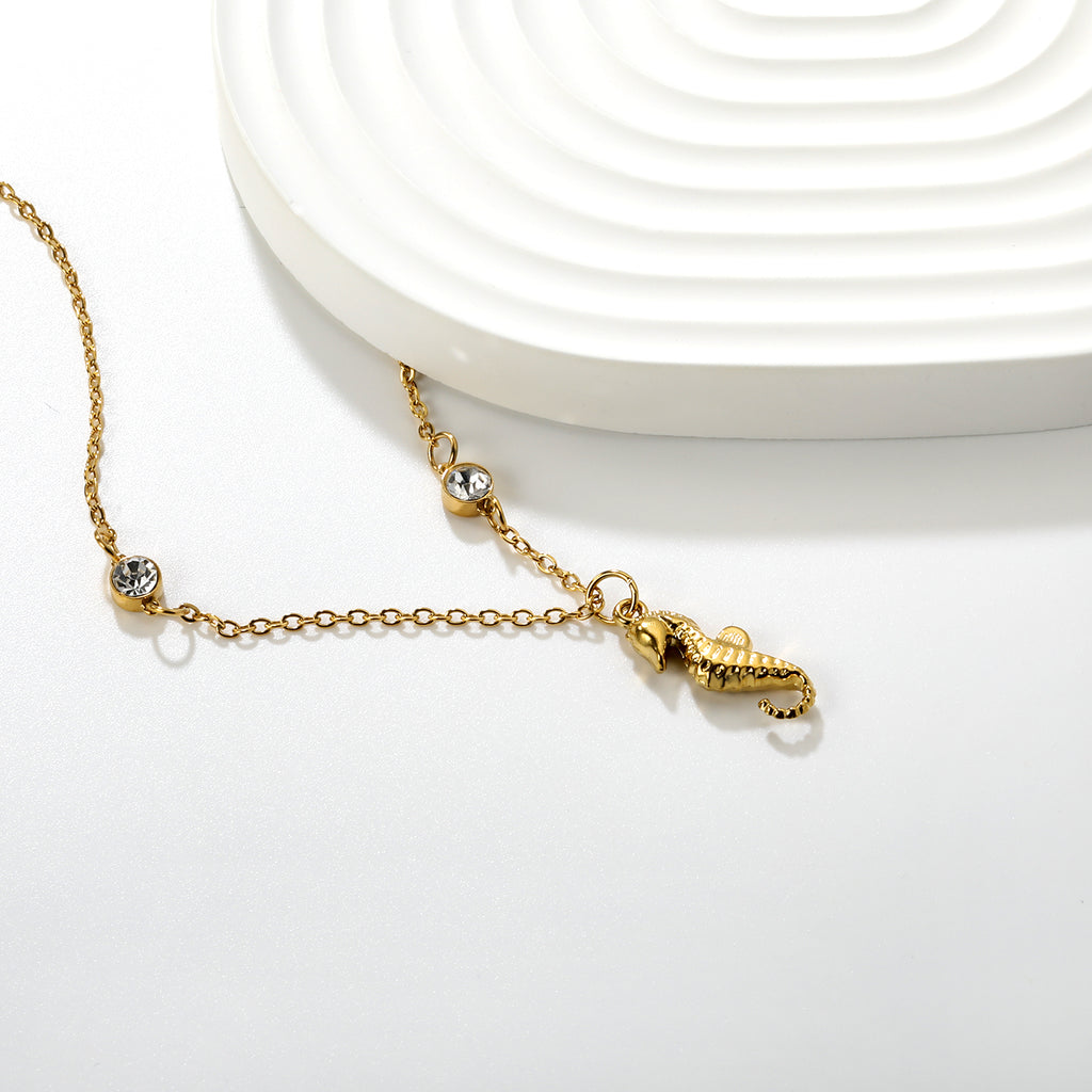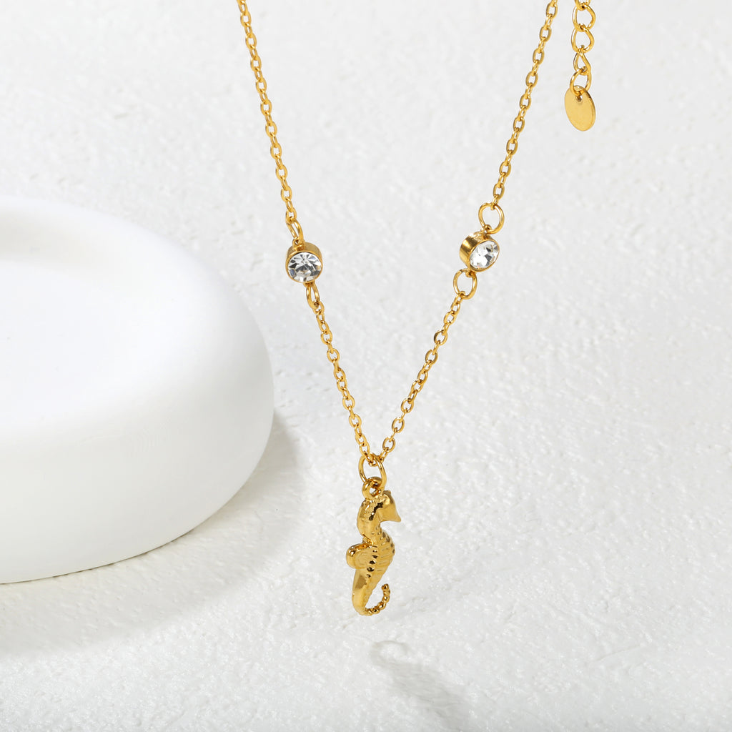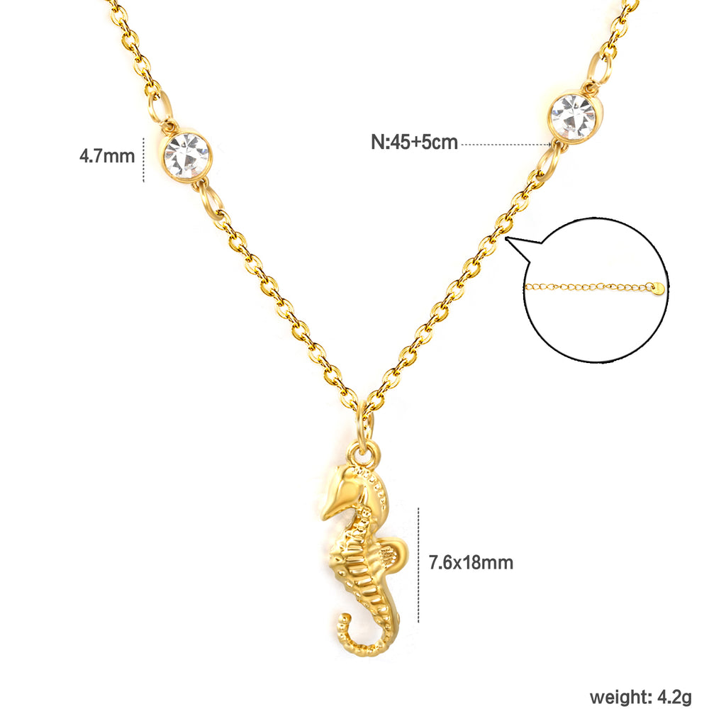 7.6*18mm sea horse pendant with double round diamonds, 0.4 cross chain, 45+5cm+6mm round tail tag, necklace, gold