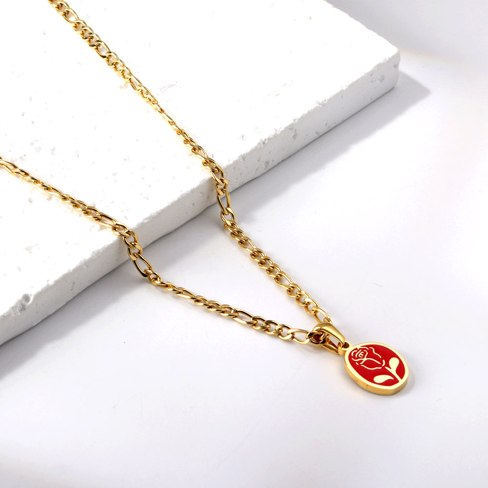 Oval Red Oil Drip with Rose Pendant Necklace 46+5cm Gold