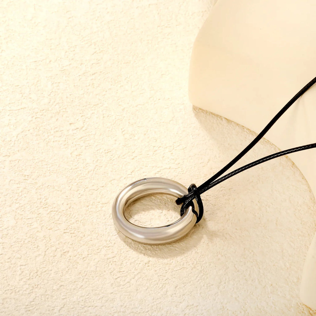 35mm Hollow Circle Pendant 45+5cm+6mm Round Plaque Leather Strap Necklace Steel/Gold