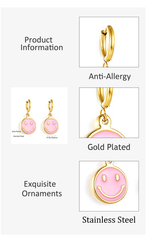 Boucles d'oreilles visage souriant rond rose en acier inoxydable