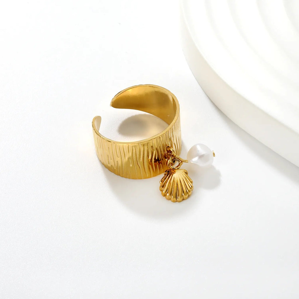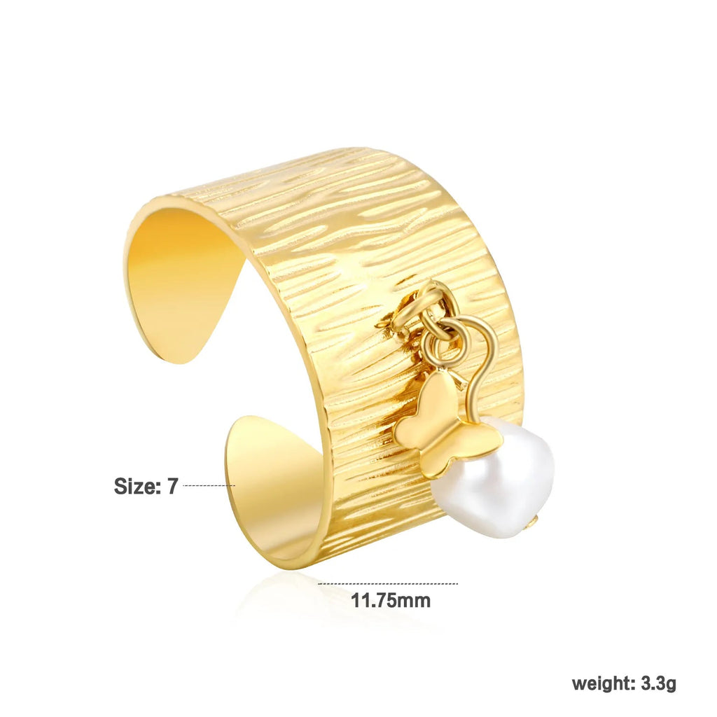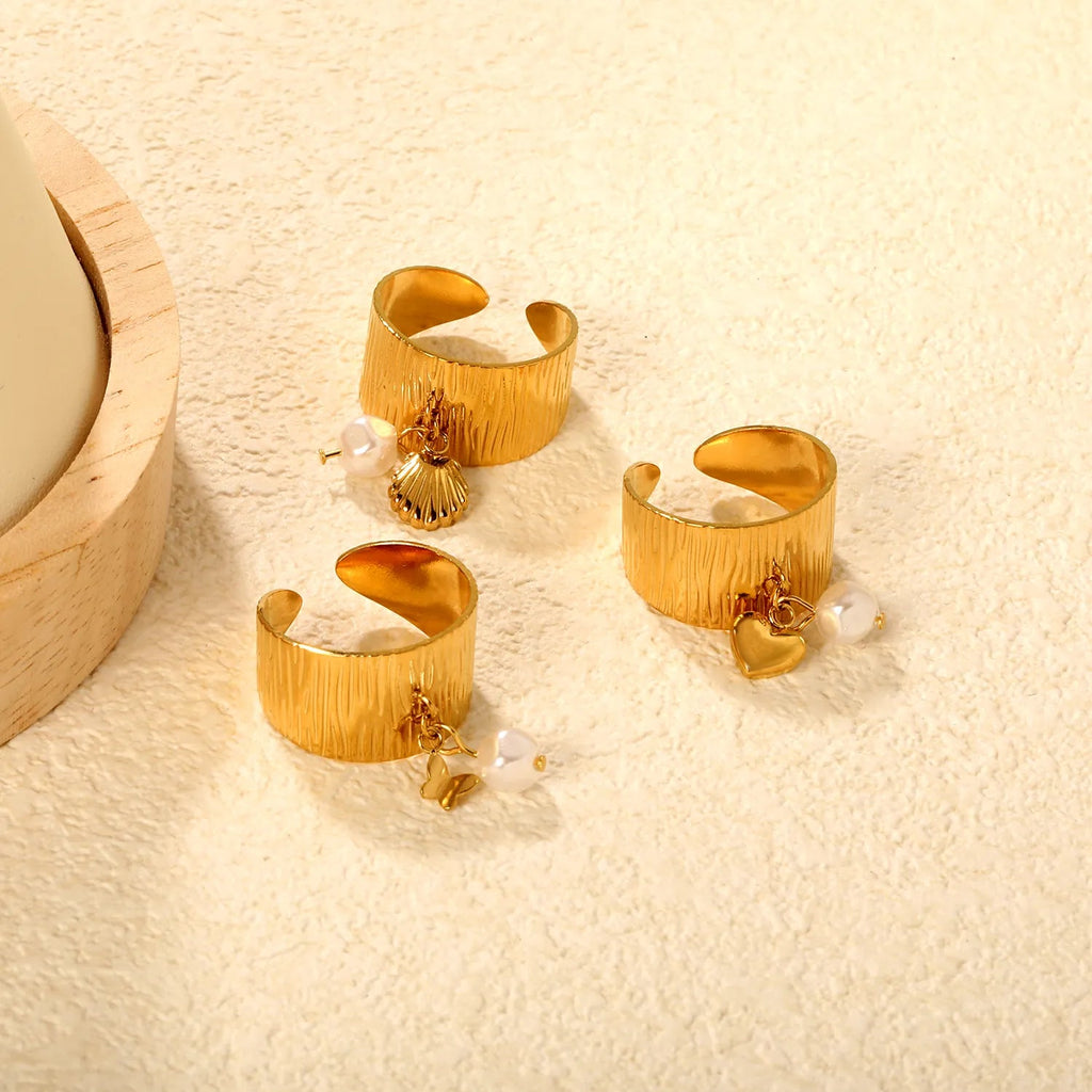 Elevate your everyday elegance with this distinctive open ring, featuring a lustrous 11.75mm imitation pearl paired with your choice of three sculptural accents—delicate heart, graceful butterfly, or organic shell motif. Crafted in warm gold-tone finish, the open band design offers a modern, adjustable fit that flatters any hand. Perfect for layering or wearing solo, this piece combines contemporary styling with timeless pearl sophistication. Size #7.