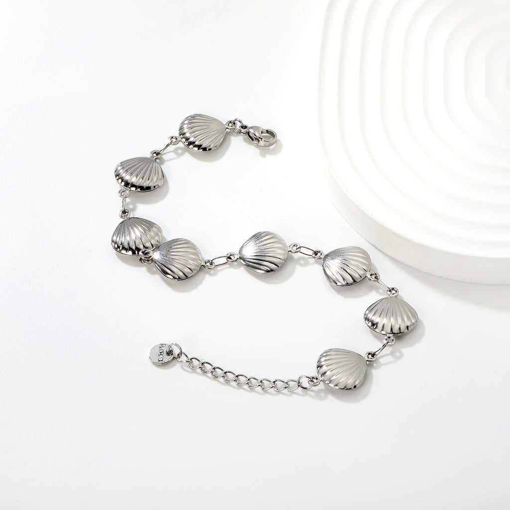 Crafted from premium stainless steel, this elegant bracelet features eight hollow shell-shaped charms suspended along an adjustable 18cm base with a 3cm extension and 6mm round tail closure. The polished gold finish delivers a refined, contemporary aesthetic suitable for layering or standalone wear. Durable construction ensures lasting brilliance, making it an ideal addition to any jewelry collection or a sophisticated gift for those who appreciate understated luxury.