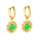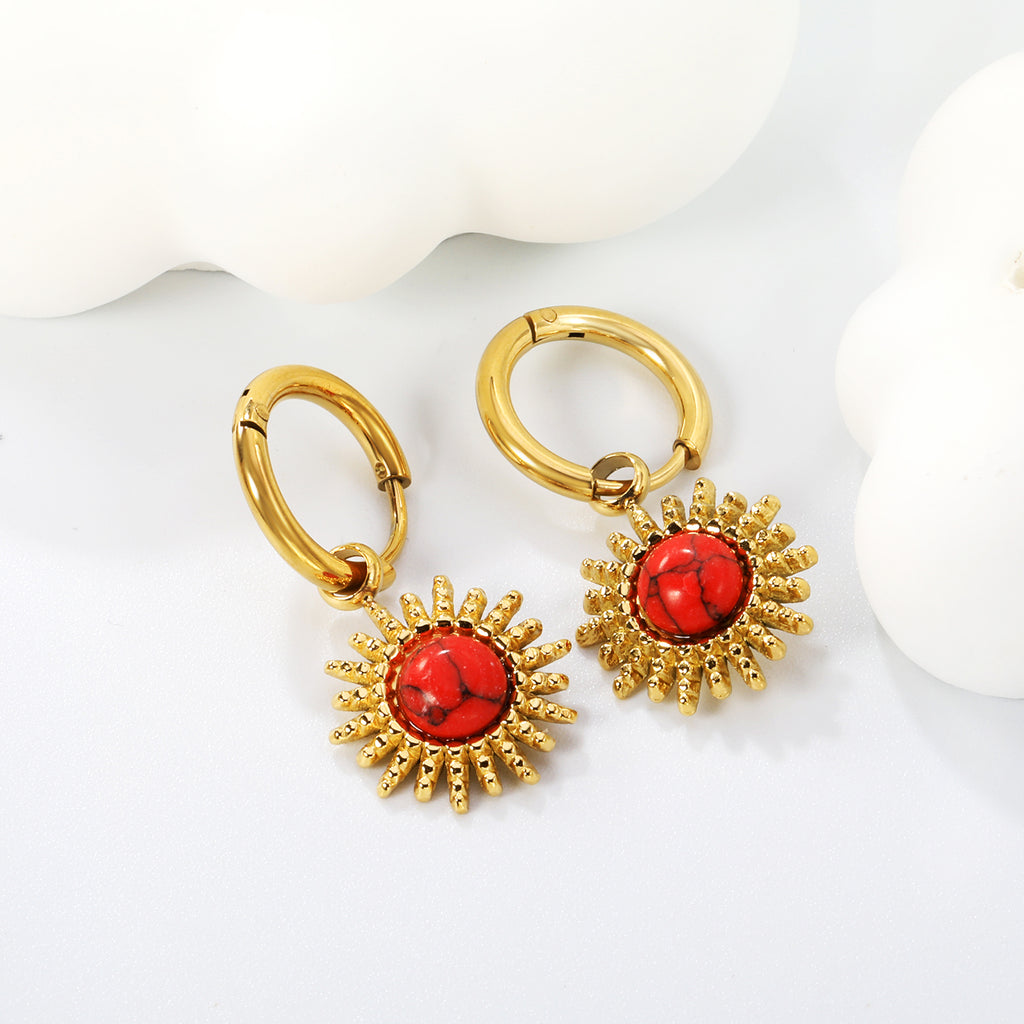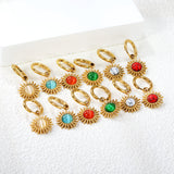 These 2*10mm circle inner diameter earrings feature a 14mm sun shaped band in imitation white cat's eye, red cat's eye, blue cat's eye, green cat's eye, white turquoise, and red turquoise, all in a luxurious gold color. Add a touch of elegance and color coordination to any outfit.