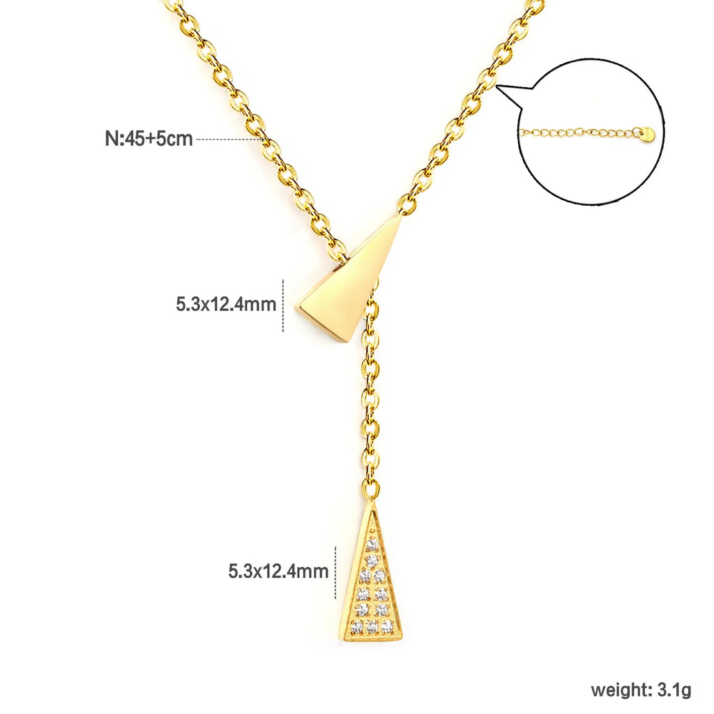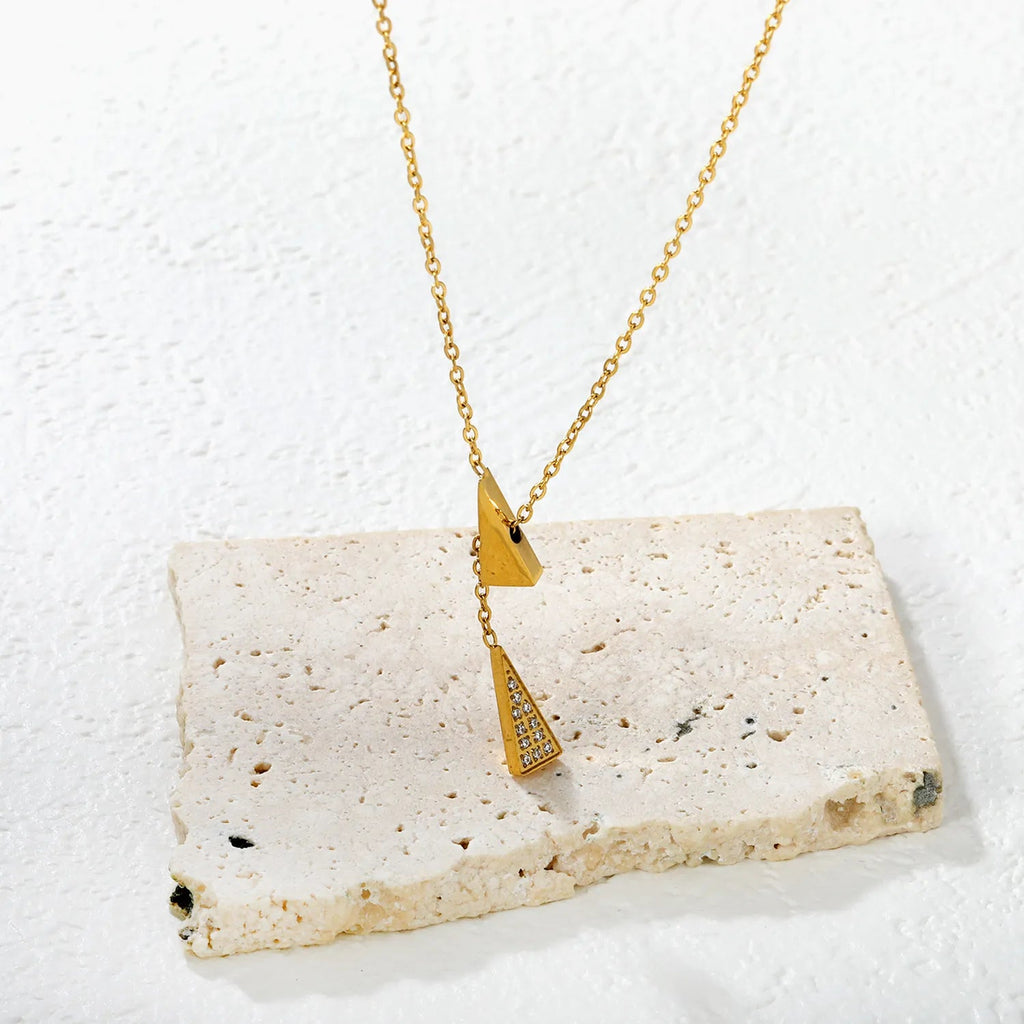 This geometric triangular pendant necklace combines two striking design elements: a diamond-set triangular charm paired with a smooth geometric triangle accent, suspended from a delicate 0.35mm cross-chain. The 45cm adjustable length with 5cm extension accommodates various necklines, while the 6mm round tag adds refined detail. Crafted in lustrous golden stainless steel, this piece balances contemporary geometry with timeless elegance—ideal for layering or wearing as a standalone statement.